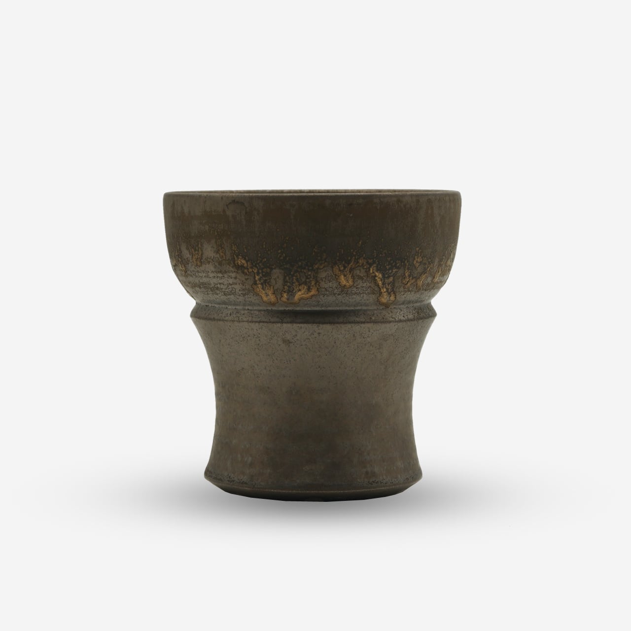 金属を思わせる質感に、派手すぎず控えめながらも存在感を放つ金色が流れ、落ち着きと品格を兼ね備えた、どこか「和」も感じさせる美しい鉢。